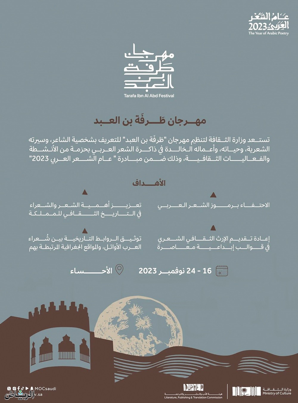 تطلق وزارة الثقافة السعودية مهرجان "طَرَفَة بن العبد" خلال الفترة من 16 إلى 24 نوفمبر المقبل في الأحساء، الذي يهدف للتعريف بشخصية الشاعر، وسيرته الشعرية، وحياته، وأعماله الخالدة في ذاكرة الشعر العربي، وذلك ضمن مبادرة "مسار الشعر العربي" التي أطلقتها الوزارة في وقتٍ سابق احتفاءً برموز الشعر العربي، وبأهمية المعلقات السبع التي جسّدت عظمة اللغة العربية وجمالها، وأبرزت جودة خصائصها البلاغية.