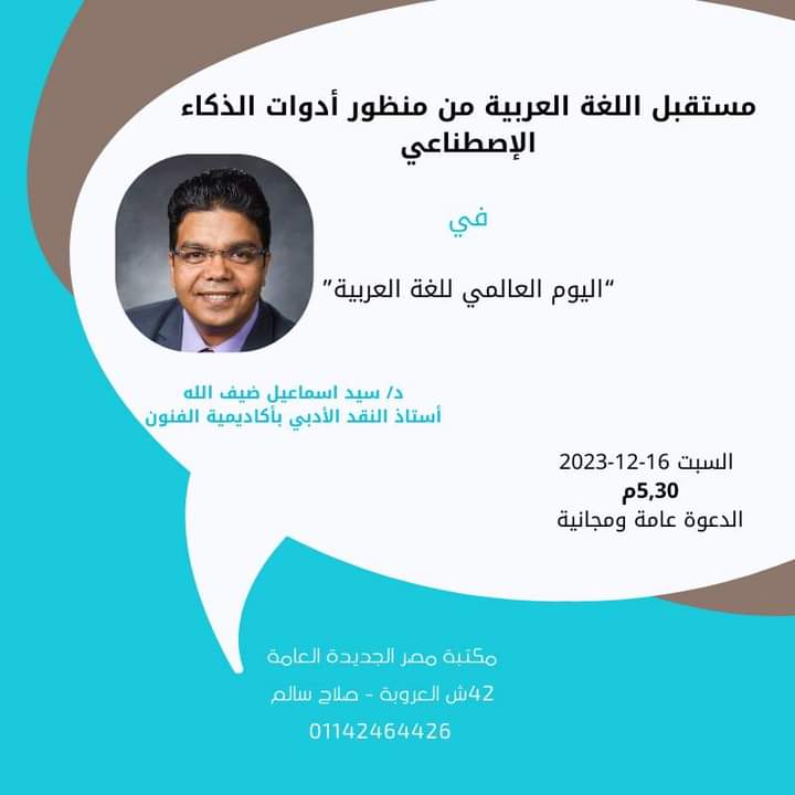 وأكد الدكتور نبيل حلمى رئيس جمعية مصر الجديدة التابعة لها المكتبة إلى أن هذه الفعالية الثقافية تأتى مواكبة لليوم العالمي للغة العربية، وسوف يلقي الدكتور سيد إسماعيل ضيف الله، أستاذ النقد الأدبي بأكاديمية الفنون محاضرة عن السلبيات والايجابيات التى تواجهها اللغة العربية من الانتشار العالمى للذكاء الاصطناعي.