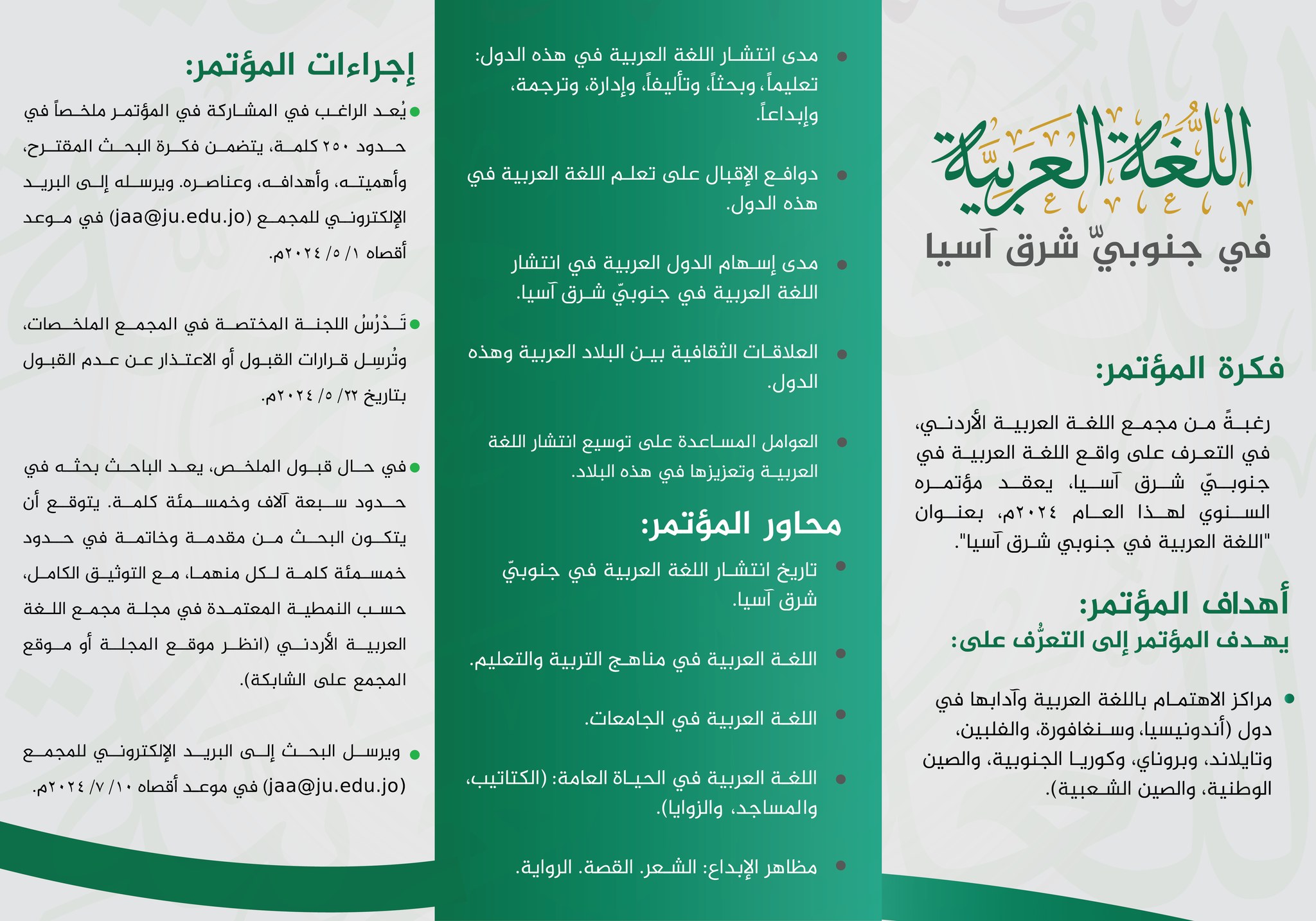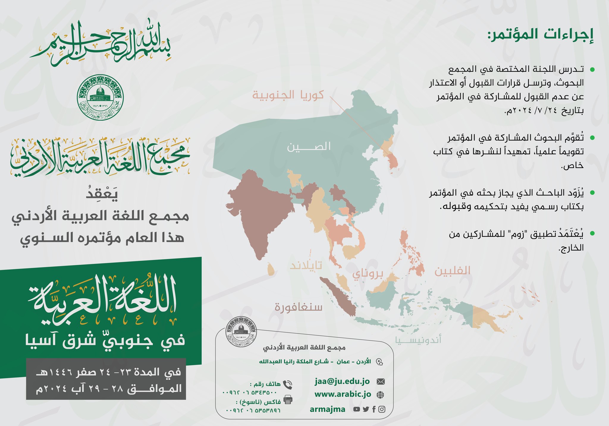 أعلن مجمع اللغة العربية الأردني عن عقد مؤتمره "اللغة العربية في جنوبي شرق آسيا" بشهر أغسطس المقبل، كما أعلن المجمع عن تمديد موعد استقبال الملخصات من الباحثين.