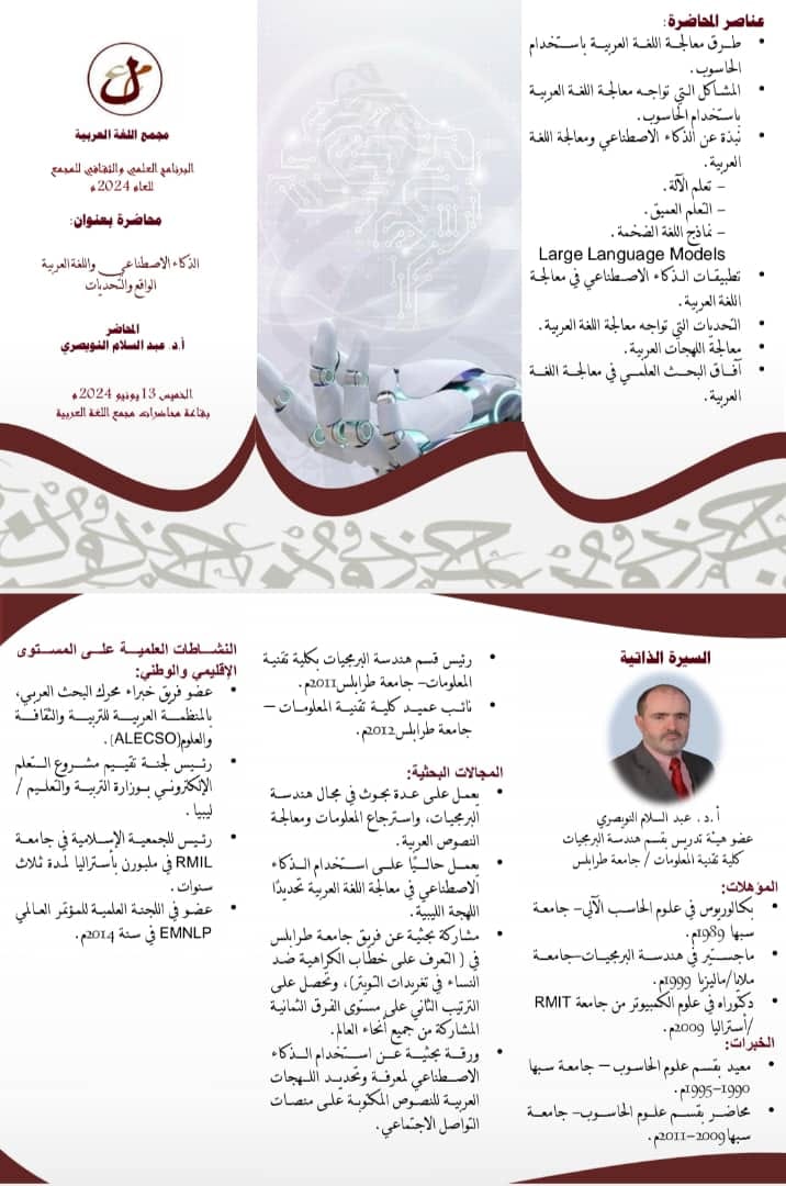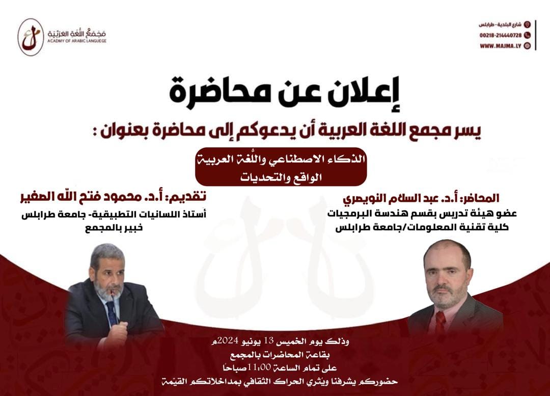 عقد مجمع اللغة العربية الليبي محاضرة (العربية وتقنية الذكاء الاصطناعي) ضمن محور نشاط المجمع وذلك اليوم الخميس 13 يونيو 2024م .