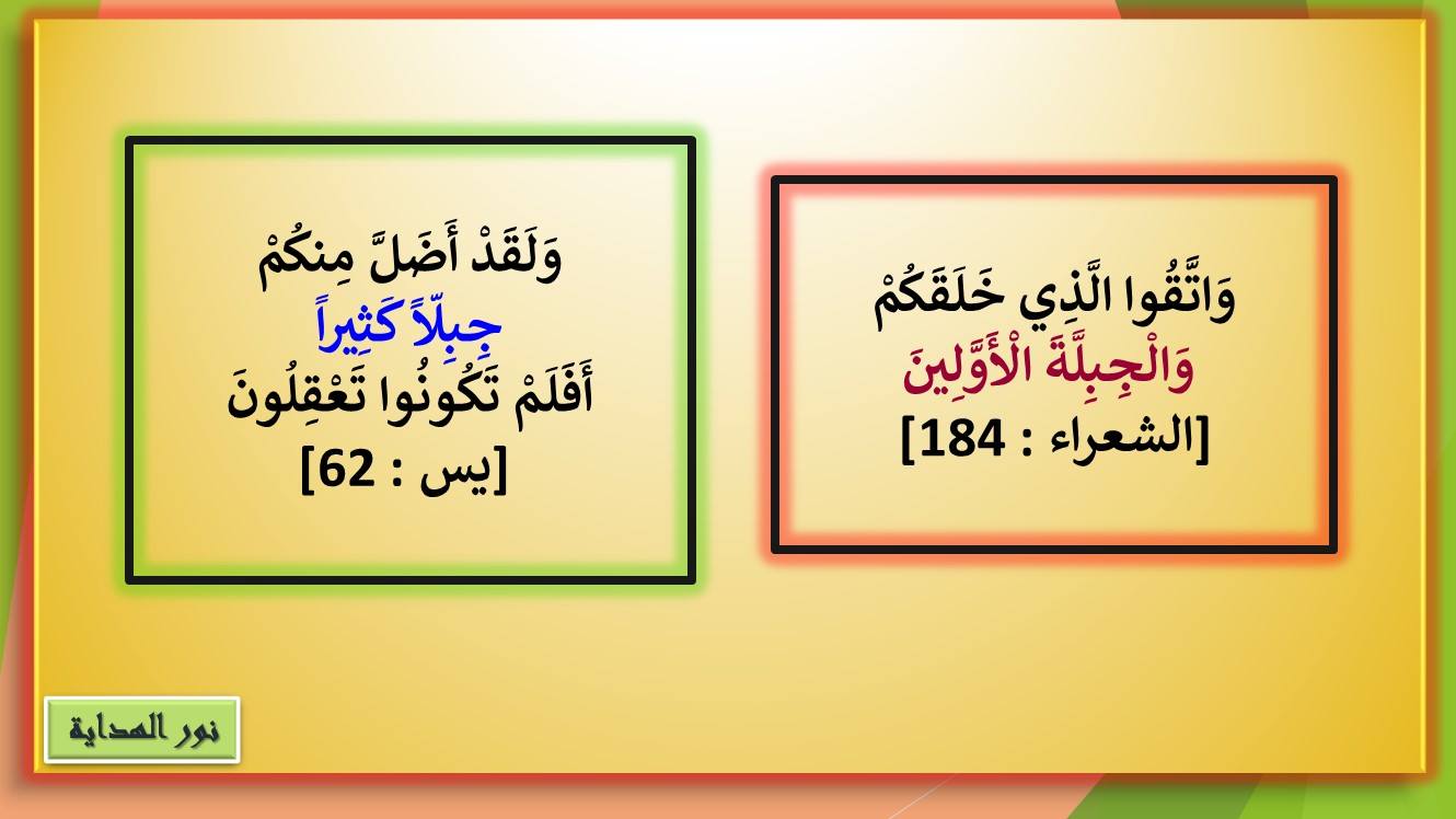 وبتغيير اللفظ قليلا نصل إلى الآية 184 في سورة الشعراء: (وَاتَّقُوا الَّذِي خَلَقَكُمْ وَالْجِبِلَّةَ الْأَوَّلِينَ) والآية 62 من سورة يس: (وَلَقَدْ أَضَلَّ مِنْكُمْ جِبِلًّا كَثِيرًا أَفَلَمْ تَكُونُوا تَعْقِلُونَ) وهي في الموضعين بكسر الجيم والباء وتشديد اللام.