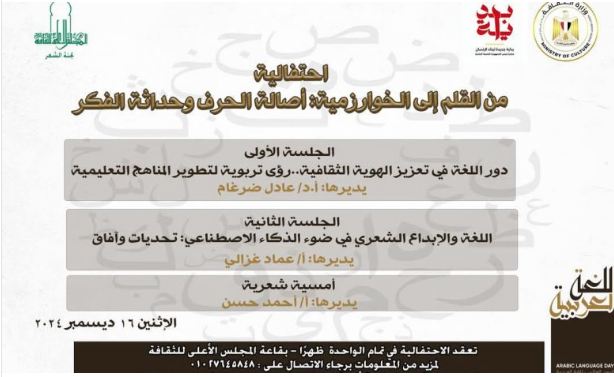 بمناسبة اليوم العالمي للغة العربية، ينظم المجلس الأعلى للثقافة، تحت رعاية أمينه العام الدكتور أشرف العزازي، احتفالية مميزة تحت عنوان "من القلم إلى الخوارزمية: أصالة الحرف وحداثة الفكر".