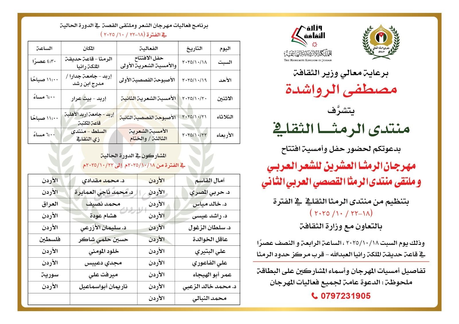 حفل الافتتاح في قاعة الملكة رانيا – الرمثا في الرابعة والنصف، ويشتمل كلمات وقراءات شعرية.