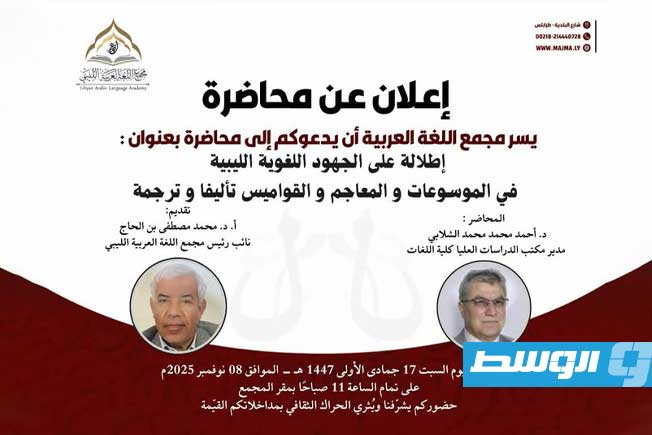 يستعد مجمع اللغة العربية الليبي لاستضافة فعالية علمية بارزة، حيث أعلن عن تنظيم محاضرة بعنوان: «إطلالة على الجهود اللغوية الليبية في الموسوعات والمعاجم والقواميس تأليفاً وترجمة».