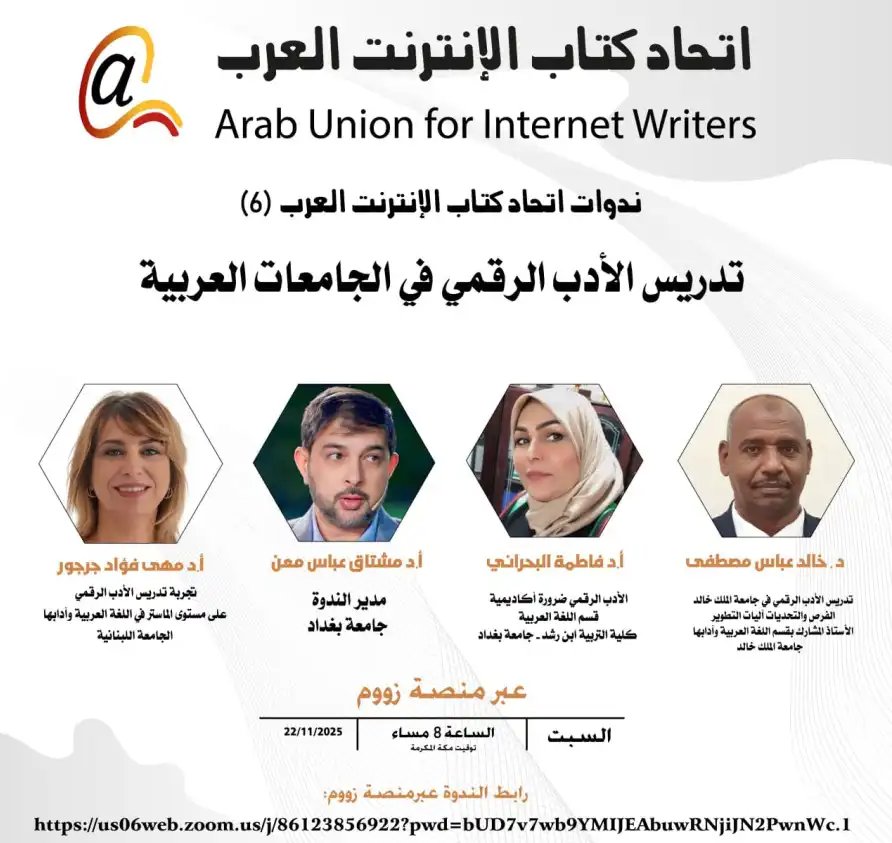 في إطار برنامجه الثقافي الشهري، يُنظّم اتحاد كتّاب الإنترنت العرب ندوة تفاعلية جديدة بعنوان "تدريس الأدب الرقمي في الجامعات العربية"، وذلك مساء السبت 22 نوفمبر 2025 الساعة الثامنة مساءً بتوقيت مكة المكرمة، عبر منصة زووم.