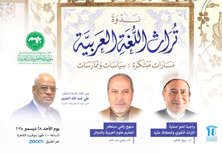 بمناسبة اليوم العالمي للغة العربية، يُنظِّم معهد المخطوطات العربية ندوة علمية افتراضية بعنوان «تراث اللغة العربية مسارات مبتكرة: سياسات وممارسات)، وذلك يوم الأحد الموافق 28 ديسمبر 2025، الساعة: 1:00 ظهرا بتوقيت القاهرة عبر تطبيق (zoom).