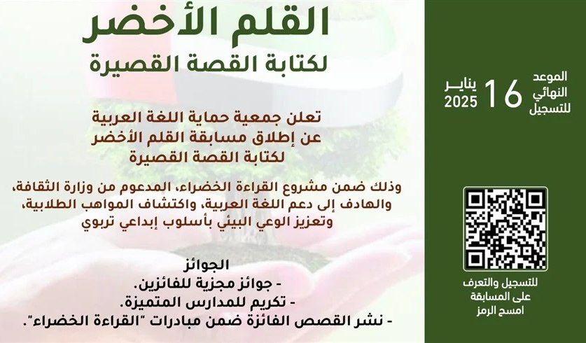 اختتمت جمعية حماية اللغة العربية التسجيل في مسابقة القلم الأخضر لكتابة القصة القصيرة، التي أطلقتها ضمن مشروعها الثقافي والتربوي "القراءة الخضراء"، بمشاركة 1210 طالباً وطالبة من أكثر من 122 مدرسة في الإمارات .