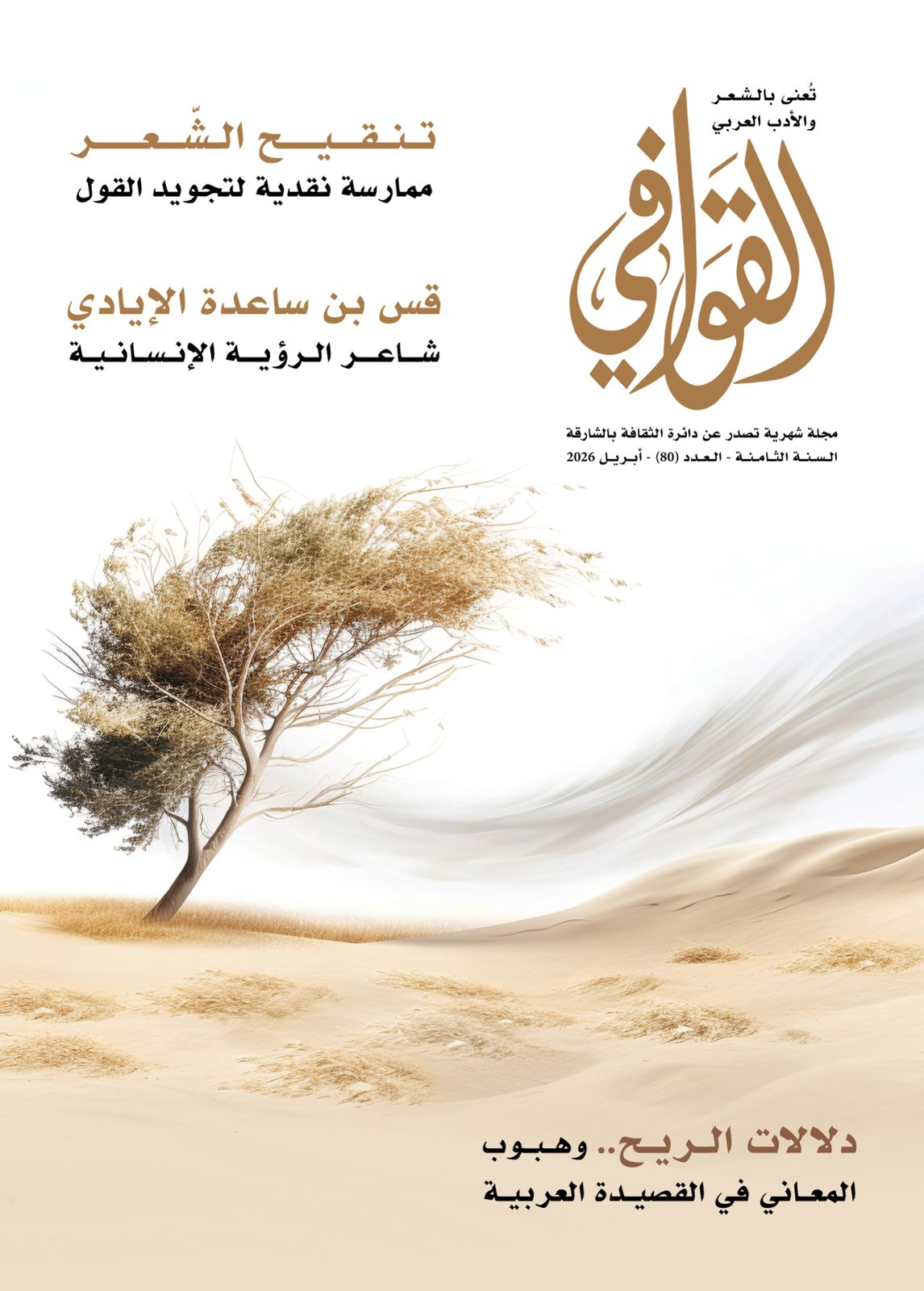 صدر عن بيت الشعر في دائرة الثقافة بالشارقة العدد 80 لشهر أبريل من مجلة القوافي الشهرية؛ المتخصّصة بالشعر الفصيح ونقده - في عامها الثامن- التي تحتفي بالمواضيع ذات الصلة به بلاغةً ولغةً وتراثًا، كما تحتفي بالشعراء من مختلف العصور.